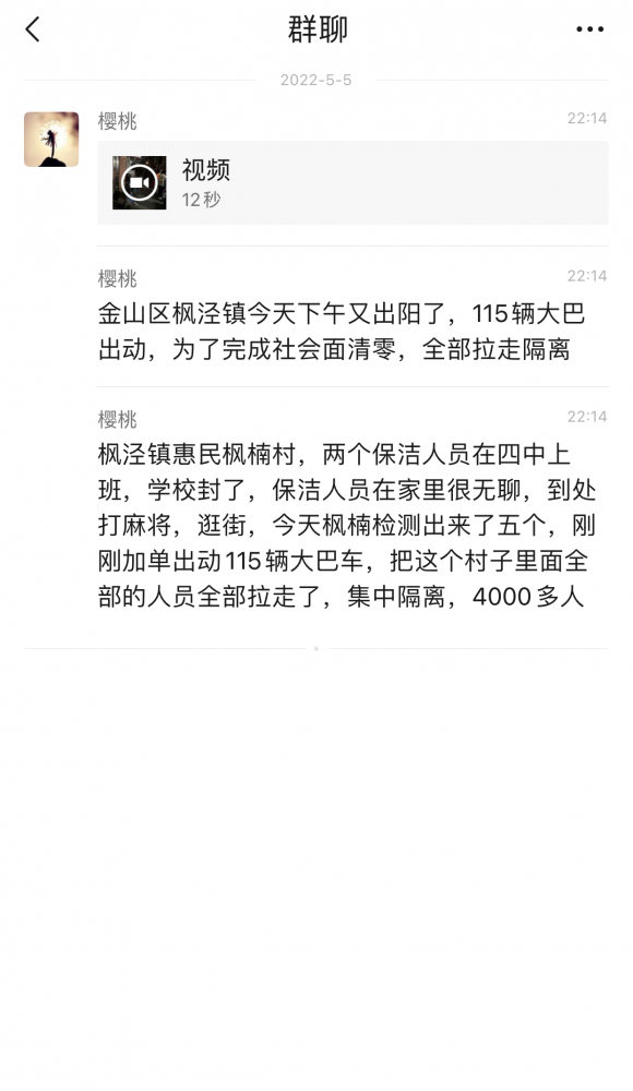 金山枫泾115辆大巴出动杨浦大面积行动,整齐划一还有一个传阅量很高的JC上门通知去隔离,得意洋洋抖脚态度趾高气扬的视频,各位自己去找吧,我上海的朋友说听里面居民的口音像是浦东那边的。还有一条是浦东陆家嘴某高级小区里住户也一样阴性被拉去隔离了,流出来的是一段住户同事的聊天记录,因为里面有真名实姓,我就不转出来了,有对门邻居拍摄的视频,里面有[
