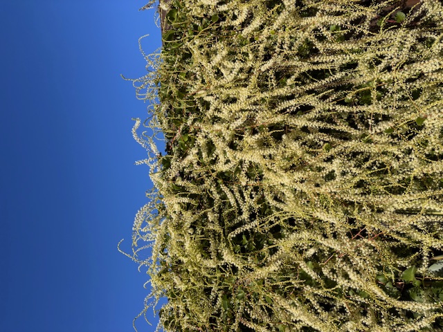 我家后院种植有几株攀爬植物“藤三七“,已经长多年了,它的藤蔓上下左右四方攀爬,把木囲栏板装饰成一堵"绿牆",从窗户望过去很是养心怡眼。它年年开花,今年秋来开得特别壮观,串串白花,垂诞欲滴,牵挂在蓝色天空底下,相益得彰。更加[