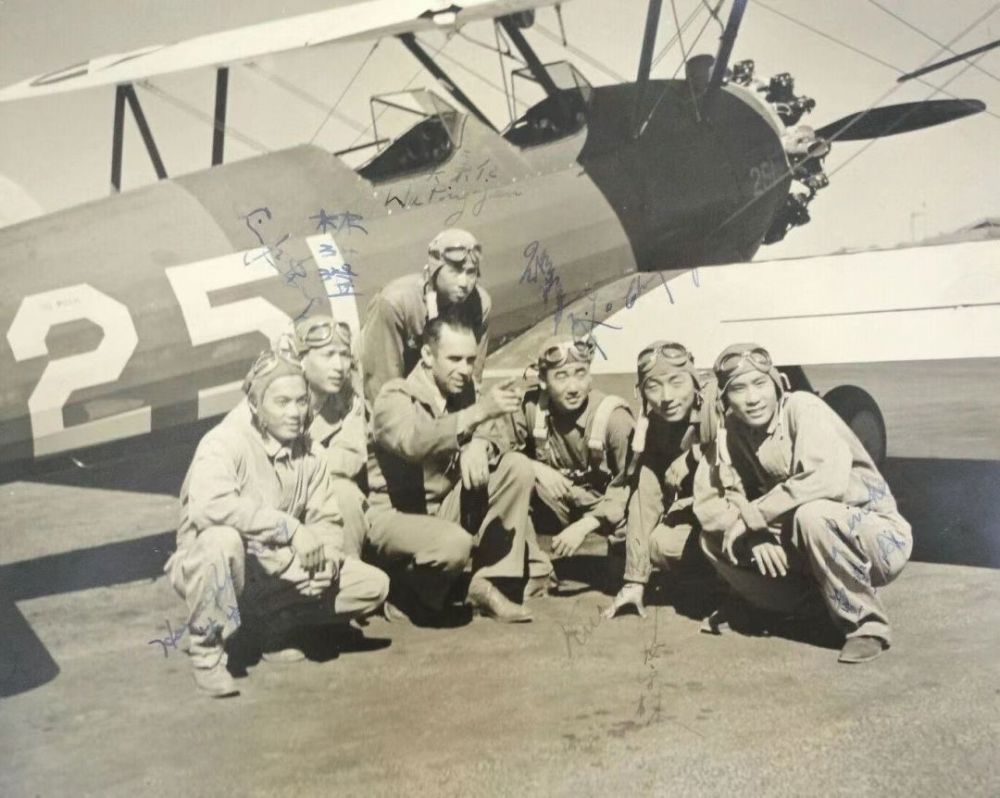 第三批留美學員初級班學生與美教官合影,背景P-17教練機。(右二)郭汝霖、(右三)羅瑾瑜烈士。