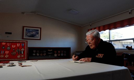 張恩福在加州養老院為作者題詞(李春鋒拍攝)