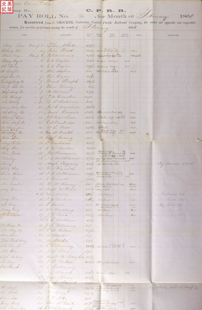 月底发工资的时候,这个头目从铁路公司领到全队的工资,再分发到每人手里。也许是因为这种依靠中介的做法,人们才没能在中央太平洋铁路的工资表上找到所有华工的名字。