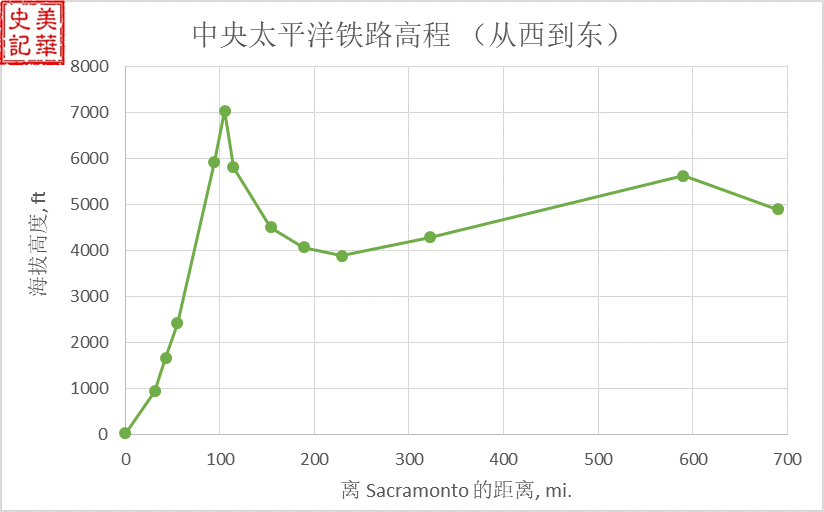 图五. 中央太平洋铁路高程示意图, 零点处为萨克拉门托,顶峰为Donner Pass处最高的隧道, 东端为接轨处的Promontory Point