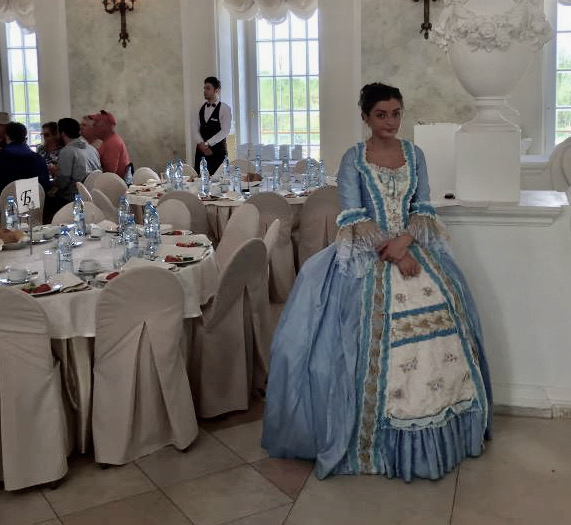 饭店在公路旁,很大的一个建筑,周围是空旷的田野。进入饭店,才看出这不是一个普通的饭店,而是一个有舞台的大宴会厅,规模很大。进大厅的台阶上站着穿俄罗斯民族服装的少女,可以与游客合影。