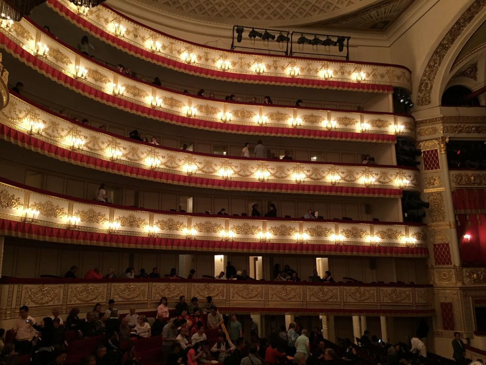 包厢是单个的小房间,有一个出入的门,一个包厢仅坐4个人。包厢连接起来,环绕着剧场。包厢链一共有5层。二层是比较好的位置。头一次坐在包厢里看芭蕾舞,让我马上有了贵族的感觉。