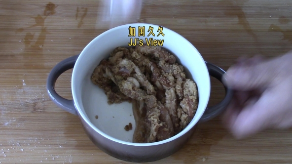 2. 腌制肉片。肉片拌好腌料后放冰箱保鲜冷藏一晚上。我提供的腌料表供参考。各人根据自己的口味增减腌料,麻辣,五香,什么口味都可以。