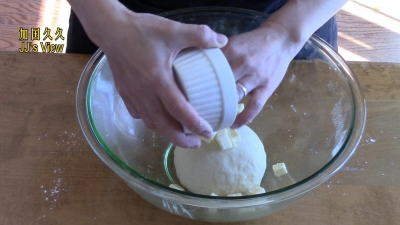2.把30克黄油丁揉入面团中,和成不粘手的面团;