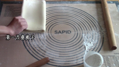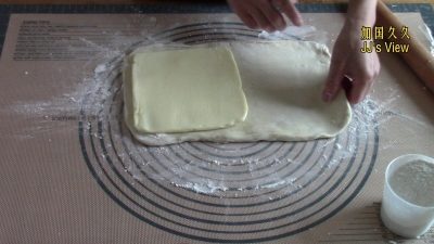 6.把包裹了黄油片的面皮擀成厚薄均匀的大薄片
