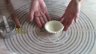 1.用模具在面皮上切割下蛋挞皮