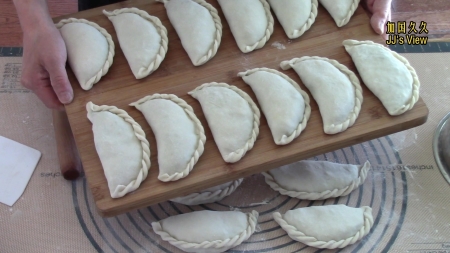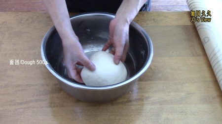配方(可做17个每个60克重的韭菜盒子): *韭菜:300克 *鸡蛋:4个 *虾仁:100克 *蔬菜油:1汤勺Tablespoon *盐:1茶勺 Teaspoon *中筋或高筋面粉:300克 *开水:100毫升 *室温水:100毫升