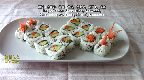 这一集的“美加流行寿司制作”视频介绍的是Veggie Uramaki roll-米饭在外的全素卷。全素卷满足了素食者的需求,另外,素卷切开后摆盘颜色特别漂亮。