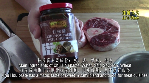 一直很喜欢粤菜中柱侯酱烧的肉菜,味道浓郁,咸甜鲜香。这些酱烧菜中尤其多的搭配是柱侯萝卜牛腩之类。手头正好有带骨牛腱(在广东叫做牛展),就做了本文的这道菜。这个菜很配米饭,做起来不难,因为它不需要其它杂七杂八的香料和调料,只需要柱侯酱就可以了(我加了点厨用酒)。