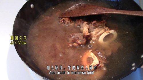 牛肉下油锅翻炒,加厨用酒和柱侯酱,加汤;