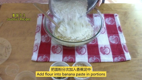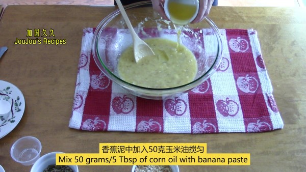 去皮熟香蕉 400 grams ;中筋面粉 300 grams;小苏打 1 tsp;白糖 30 grams;盐 1/4 tsp;鸡蛋 2 pcs;玉米油 50 grams;花生碎或其它坚果碎 70 grams: