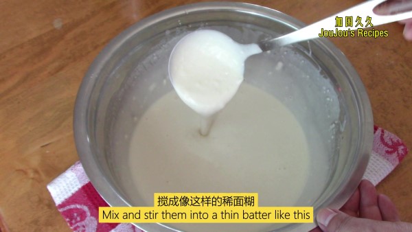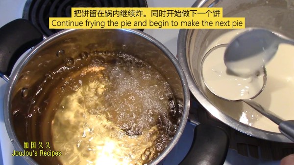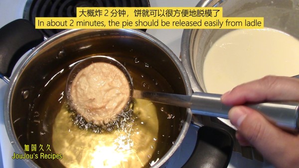 2.做饼的汤勺要在油中加热后再倒面糊,这样方便脱模