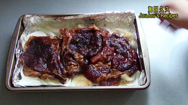 用料表(供参考): 带骨猪扒 700 grams; 厨用酒 3 Tbsp; 生抽 3 Tbsp; 老抽(可不用)1 Tbsp