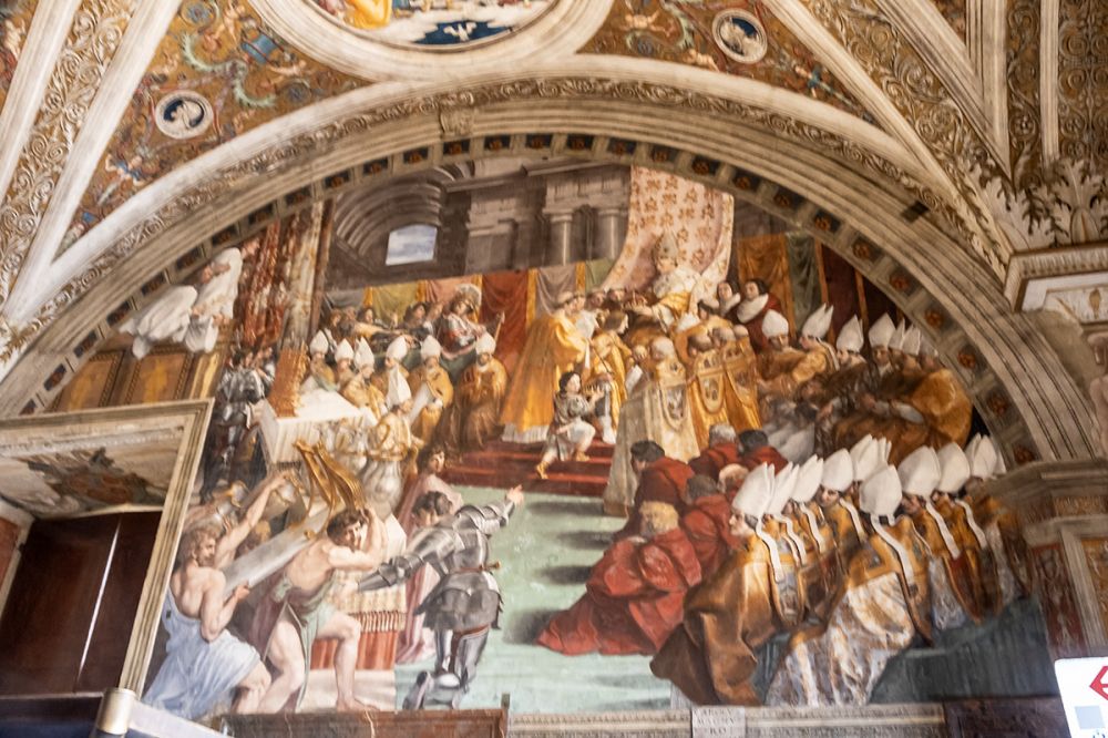 8.《查理曼加冕》(The Coronation of Charlemagne by Leo III)拉斐尔 于1516-1617创作,壁画描绘了一件具有重大历史和宗教意义的事件:公元800年,教皇利奥三世(Pope Leo III)为查理曼(Charlemagne)加冕为神圣罗马皇帝