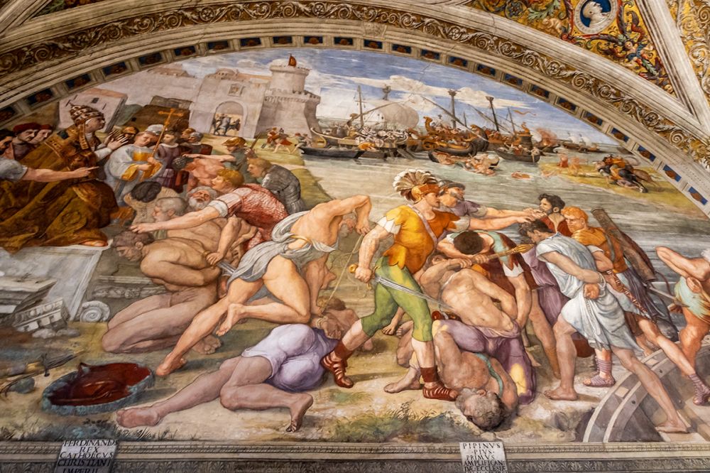 9.《奥斯特亚战役》(The Battle of Ostia)拉斐尔 奥斯特亚战役发生在9世纪,当时撒拉森人(Saracens,即阿拉伯海盗)频繁袭击意大利海岸,威胁到罗马的安全。教皇利奥四世(Pope Leo IV)组织了一支由意大利城邦组成的联合舰队,在奥斯特亚港附近的海域与撒拉森人展开战斗。