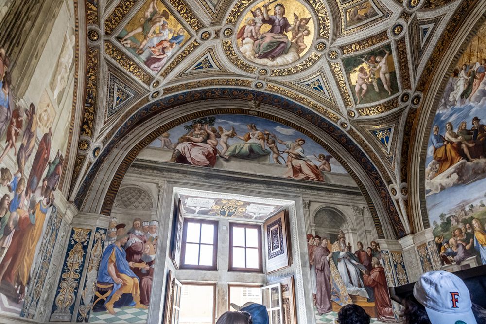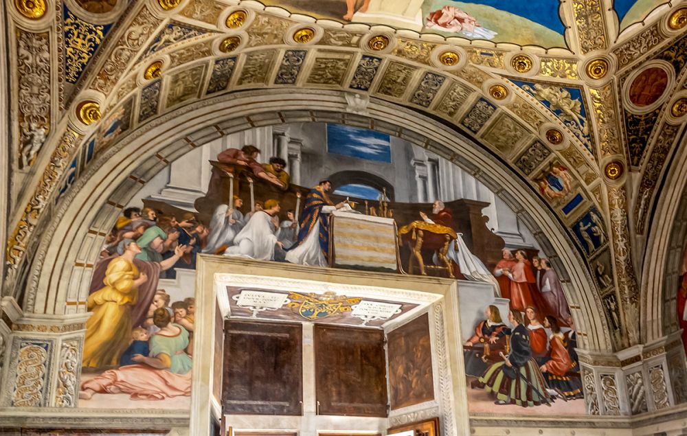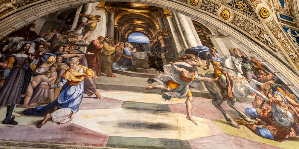 5.《将赫略多洛赶出圣殿》The Expulsion of Heliodorus from the Temple 是拉斐尔的一幅湿壁画,这幅画绘于1511年至1512年间. (游客人多,照片是不在同一地点拍的两张拼接的,画上人物有点变形)。壁画取材于旧约故事,述了叙利亚王的财政大臣 赫略多洛(Heliodorus) 试图掠夺耶路撒冷圣殿的财宝,但被神秘的天使击退的故事,强调任何企图掠夺教会财富的人都会遭到天谴。画中右下角赫略多洛身穿盔甲,被击倒在地,呈现痛苦挣扎的姿态,象征他受到上帝的惩罚。一位全副武装的骑士(象征神的战士)骑着腾空跃起的战马,挥舞长矛冲向赫略多洛。另外两位天使手持长鞭,猛击赫略多洛,表现出神罚的威严。特喜欢画里两个天使和骑士的姿势,充满动感。据说拉斐尔把自己也画进去了,是最右边的那个是他自己