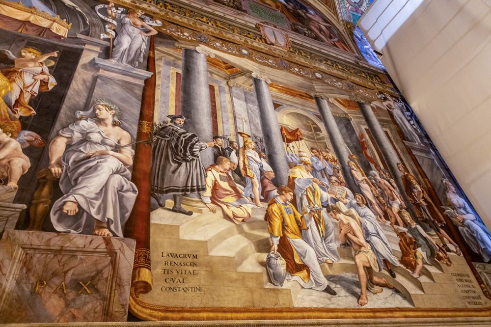 11《君士坦丁的洗礼》(The Baptism of Constantine)拉斐尔创作于1517 - 1524,这幅壁画描绘了罗马皇帝君士坦丁大帝(Constantine the Great)接受基督教洗礼的场景,标志着基督教在罗马帝国的合法化和普及。君士坦丁大帝是罗马帝国历史上的一位重要皇帝,他在公元312年的米尔维安桥战役(Battle of the Milvian Bridge)前,据说看到了天空中的十字架和“凭此符号取胜”(In hoc signo vinces)的异象。这场战役的胜利使他相信基督教的神力,并在公元313年颁布了《米兰敕令》(Edict of Milan),宣布基督教在帝国内合法化。根据传统记载,君士坦丁大帝在临终前接受了基督教的洗礼。这一事件通常被认为发生在公元337年,由教皇西尔维斯特一世(Pope Sylvester I)在罗马的拉特兰宫(Lateran Palace)为他施洗。君士坦丁的洗礼象征着基督教从受迫害的宗教转变为罗马帝国的官方宗教。