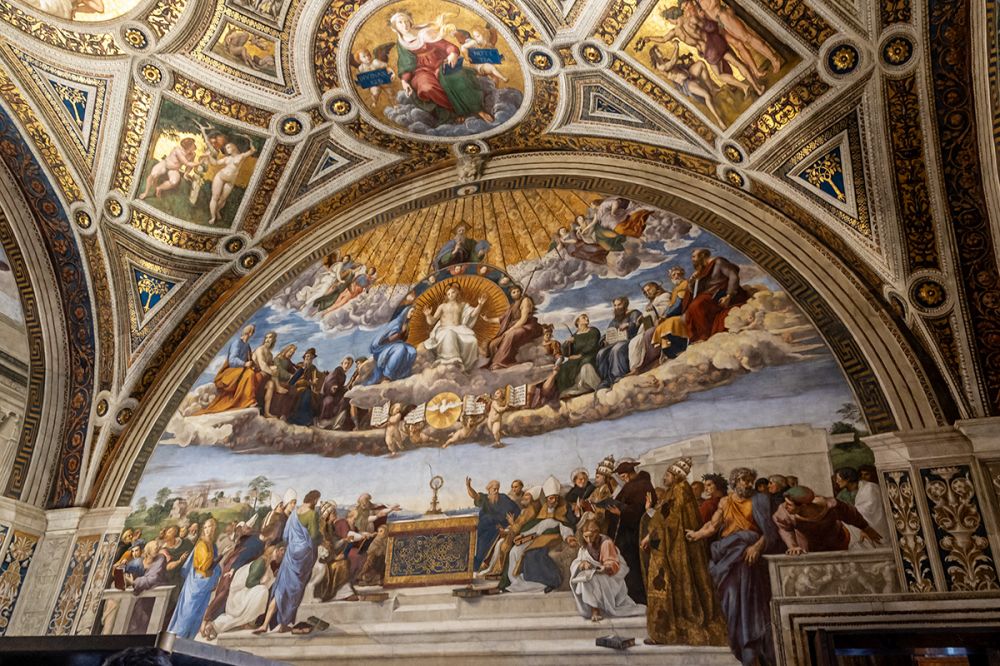 4. 《圣礼的争辩》Disputation of the Holy Sacrament 拉斐尔创作的一幅湿壁画,于1509年至1510年间创作, 画面主要分为两个层次:天上和人间。在天上,上帝位于最顶端,两侧有诸天使。耶稣位于上帝下方,两边分别是圣母和施洗约翰,后面坐着诸使徒和圣人。耶稣下方有一个圆,园中有一只鸽子,象征着圣灵。在人间,画有正在争论弥撒圣礼的圣徒们。