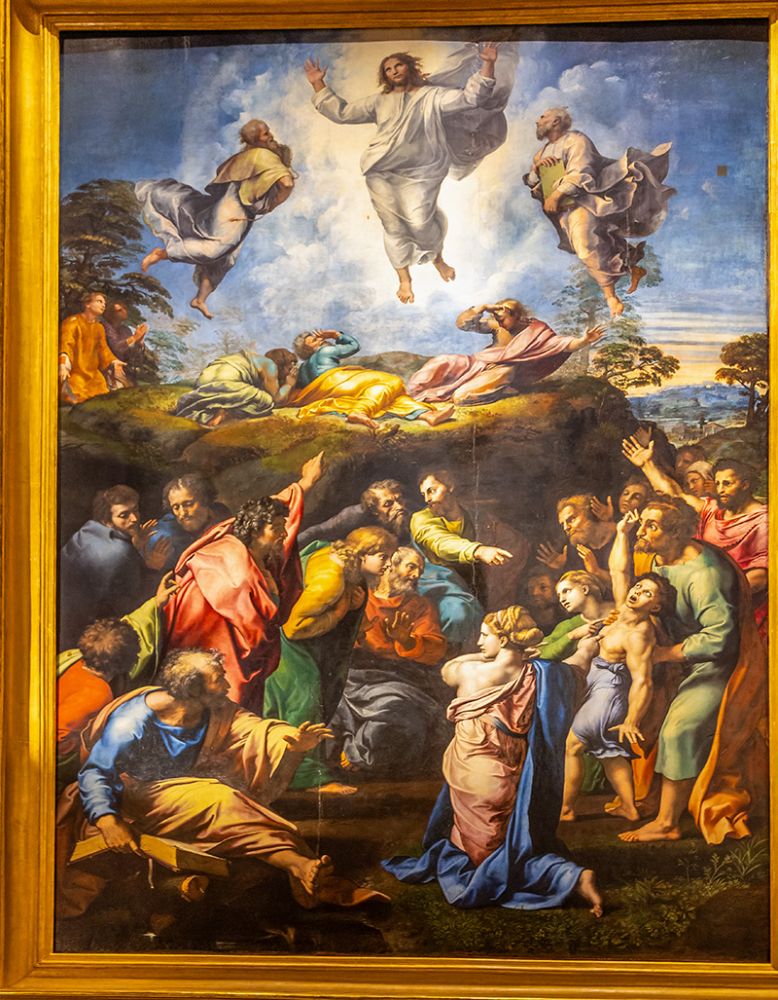 13 《耶稣显圣容》(Transfiguration) 拉斐尔的最后一幅画作, 在 1520 年去世前的数年中,拉斐尔一直在努力完成这幅画。因此这幅画标志了拉斐尔作为艺术家职业生涯的顶峰. 《耶稣显圣容》描绘了两个圣经故事,上半部分是基督的变形,基督变形的场景充满了神圣的光辉,耶稣悬浮在空中,摩西和以利亚分列两侧,三位门徒则伏倒在地,表现出敬畏和震撼。拉斐尔运用明亮的色彩和柔和的笔触,营造出一种超凡脱俗的氛围。下半部分是被鬼附身的男孩,被鬼附身的男孩和周围的人群构成了一个充满戏剧性和情感张力的场景。拉斐尔通过人物的动态表情和姿态,展现了人类的痛苦、无助和信仰的挣扎。上半部分的神圣与下半部分的世俗形成鲜明对比,但两者通过光线和人物的视线联系在一起。耶稣的光芒似乎穿透了画面,暗示着神圣的力量将拯救人间的苦难。
