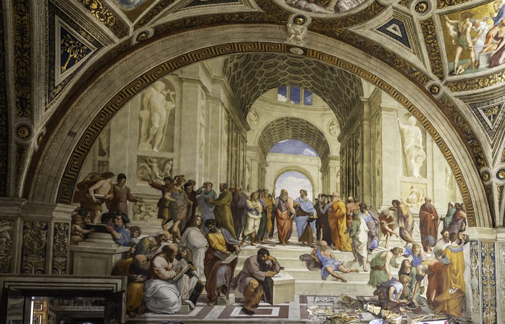 3.《雅典学院》Scuola di Atene,一译《雅典学派》,是意大利文艺复兴艺术家拉斐尔因受任装饰梵蒂冈使徒宫,而在1509年至1510年间创作的一幅湿壁画,位于拉斐尔房间的签字厅 (照片上传后色彩变化太大惨不忍睹,多次尝试编辑图片重新上传都没有改善)