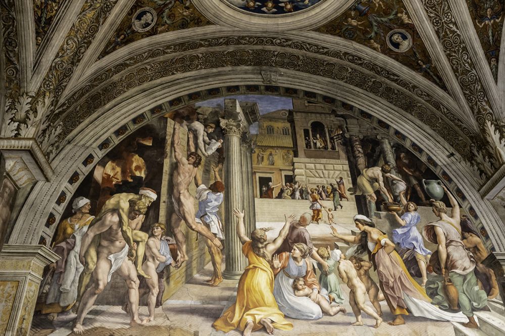 7. 《梵蒂冈城门外的火灾》The Fire in the Borgos, 是拉斐尔的一幅画作,绘于1514年至1517年间, 灵感来源于公元847年发生在罗马博尔戈区(Borgo,一片靠近梵蒂冈的居民区)的一场大火。博尔戈区位于梵蒂冈城外,是当时教皇辖区的重要组成部分。这场火灾据说是由萨拉森人(Saracens)的袭击引发的,火势迅速蔓延,威胁到圣彼得大教堂和周围的建筑。传说中,教皇利奥四世(在位期间:847-855年)在关键时刻站出来,用祈祷和祝福的力量奇迹般地扑灭了火焰。