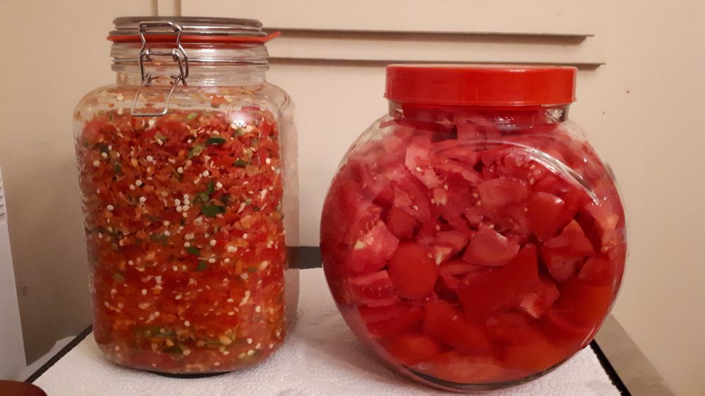 秋天是收获的季节。周末去农场摘回一大一小两纸箱的西红柿,红椒,青椒,茄子。西红柿酸和剁椒终于做好了。