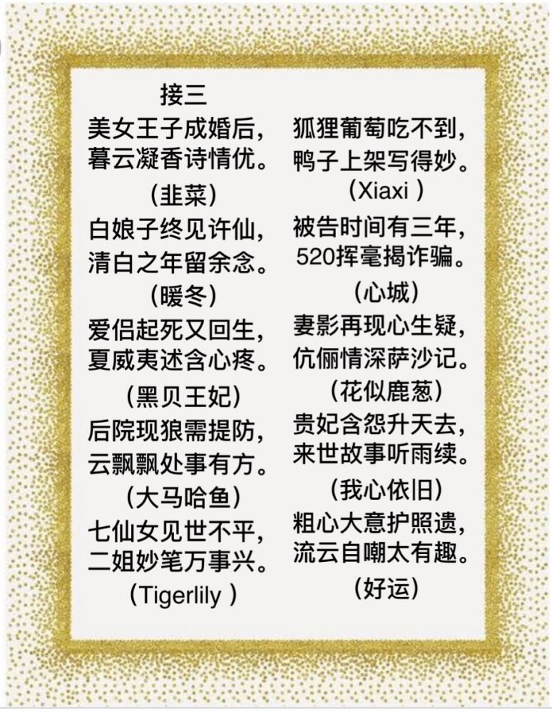 说到猜作者,我实在是学渣级别。最后要交卷了,在王妃娘娘和禾儿神探的提示下,我对大概一半的作者有点感觉,可另一半咋办呢?这时候,有古道热肠的侠女出现了:‘山韭菜’贴出了她的答案!尽管有一两个和我猜的不同,可牵一发动全身哦,我干脆就全盘接受了韭菜的选择,被学霸‘一帮一、一对红’给带及格了~~我最后好像还比韭菜多了一分,因为我蒙对了‘我心依旧‘的文,然后也猜对了韭菜隐藏了的她自己的马甲(否则情何以堪哦!)