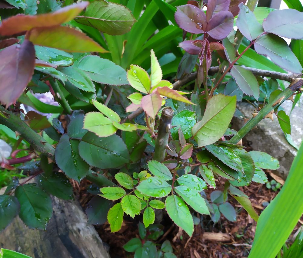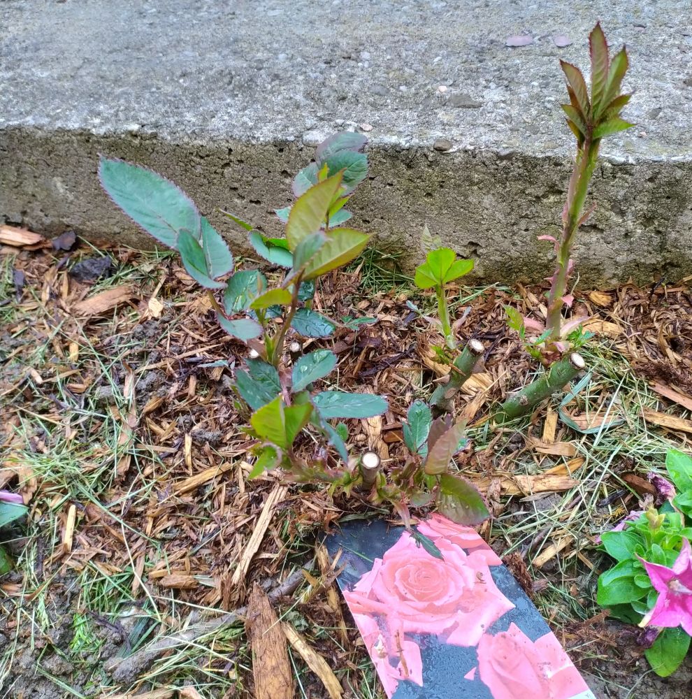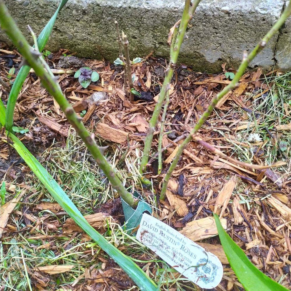 第二天开车一个多小时,终于到了那个偏远的小农场,取到了我心爱的花花。但是取货的那一刻,我又被震精了。那是一个所谓的裸根玫瑰,就是一个塑料袋包着一根光秃秃的玫瑰根茎,还有一团泥散落在袋子的底部。我的心一下子就凉了。各种马在奔腾啊!这能种活吗?木办法啊,硬着头皮上吧。回家后,按着老办法松了土,再次犯傻地种在树荫下。过了2天,就知道又闯祸了。原来已有的小芽开始蔫了,其中一支小光杆还开始发黑了。不能再犹豫了,再次使出乾坤大挪移,把它转到阳光直射的围栏边上。又去Home Depot买了mulch铺在它的边上保温保湿。这两天终于遏制住恶化的趋势了,有3个枝条再次出现了小芽点。哎呀,我的麻呀!吓死我了。