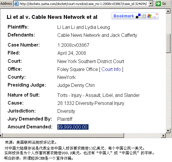 附件:2008年四月,中国官媒搞新闻篡改和自残后栽赃,几个华裔趁火打劫搞讹诈诉讼的法庭记录。