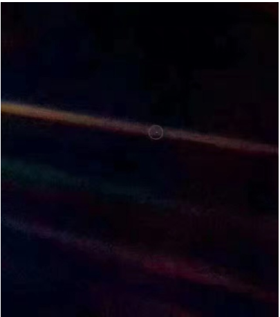 这是一张著名的照片。1990年,旅行者1号探测器即将飞出太阳系的时候,在离地球60亿公里的地方,它回头再看一眼,拍摄了60张照片,其中一张上正好包括