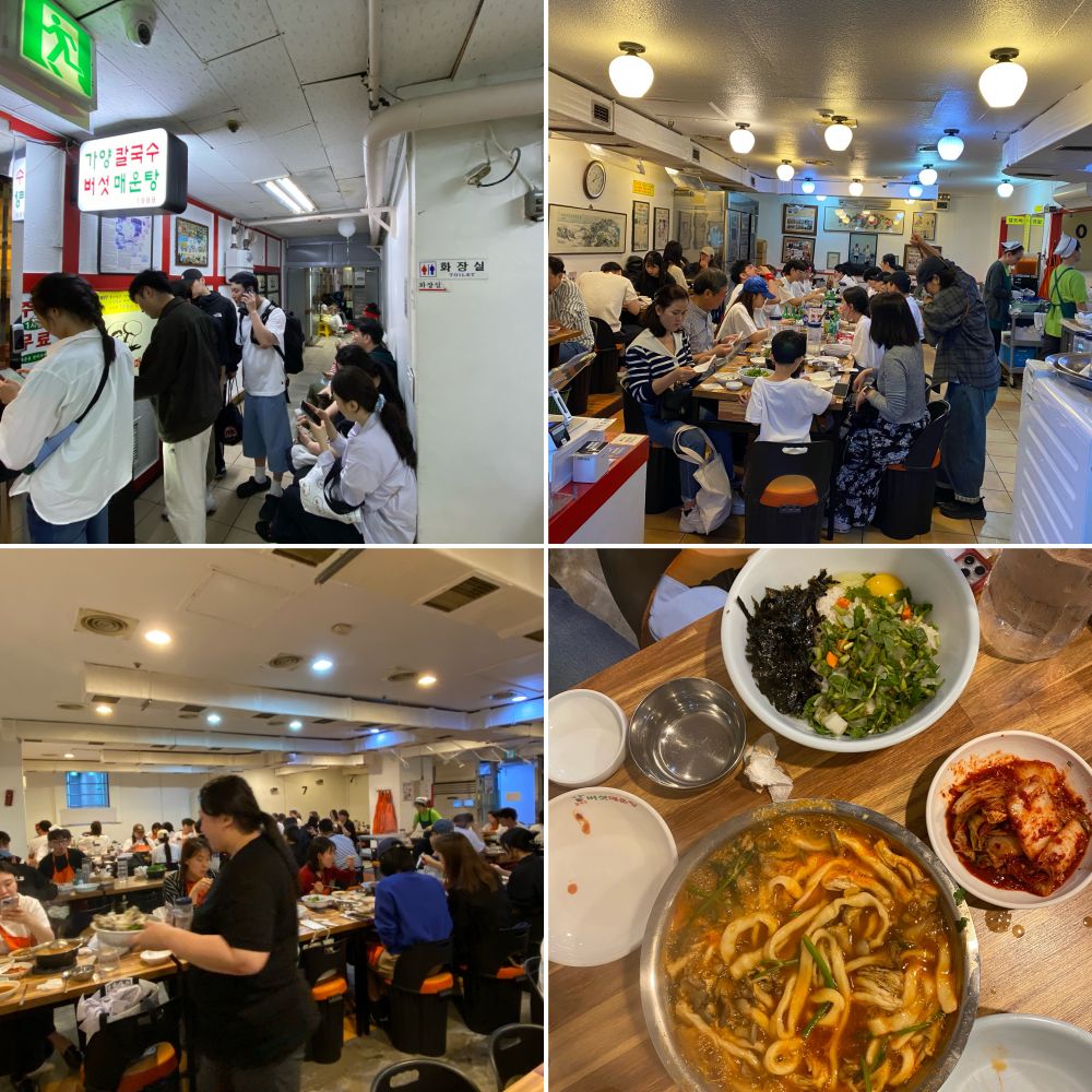 女儿在旅行日记中记录了我们在首尔的一次用餐经历:礼拜结束后,我们决定去探访一家著名的“网红店”——刀切面蘑菇辣汤(Beoseot Maeuntang)。然而,原定的餐厅周日没有营业,我只好带着爸爸步行约十分钟前往另一家分店。爸爸有些饿急了,开始抱怨为什么要走这么远,为什么不能在路边随便找家评价不错的餐馆。我们到达目的地后,发现这家餐厅隐藏在一座看似办公楼的建筑中,入口并不显眼。找到招牌后,我们先是上楼寻找无果,又下楼向保安询问,最终才得知这家网红店位于地下一层。一下楼梯,我们立刻看到了排队的人群——约有三十人,其中大部分是身穿红白比赛服的年轻或年长的球迷。