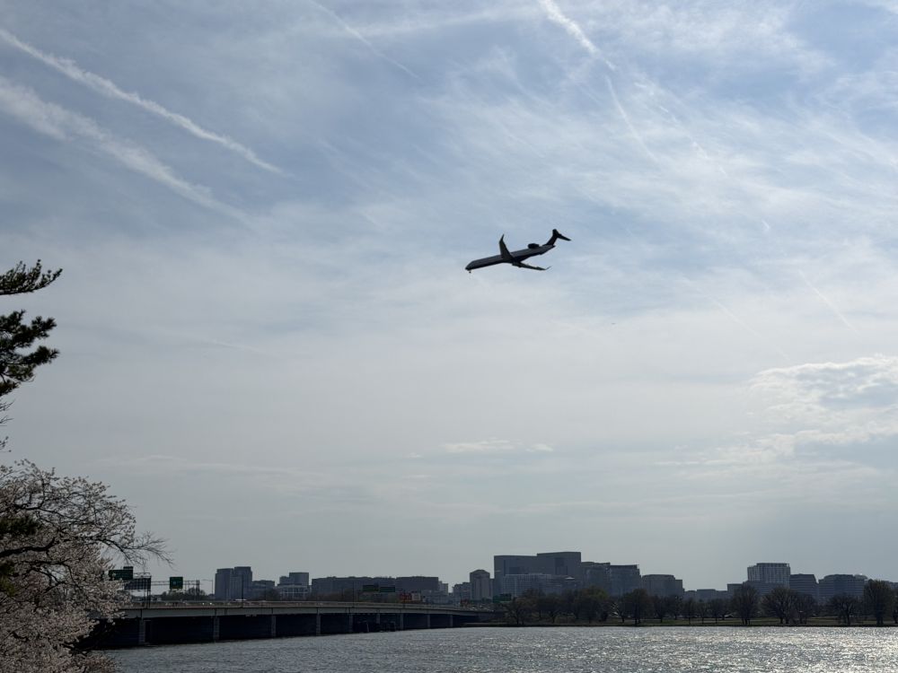 湖边不远处就是华盛顿的里根国家机场,每隔一两分钟便有飞机从湖面上空低空掠过。庞大的机身缓缓飞行,几乎贴着视线滑过,场面十分壮观。