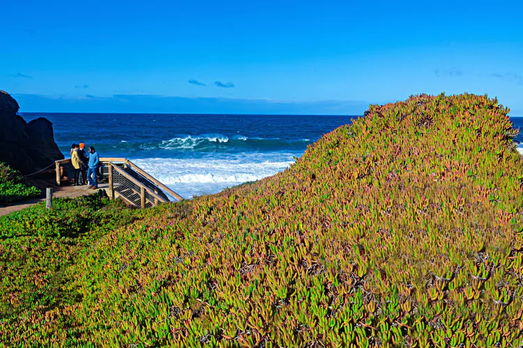 朋友给我看了一张山谷中开满白色马碲莲的照片,便心心念念地想着一定要去寻找这一片美丽的山谷。从朋友家出发,经Carmel 进入一号路,不一会就到了Garrapata State Park。只见山坡上、地面上覆盖着像极了仙人掌类的植物,郁郁葱葱,生机勃勃。朋友说,等到春天时,这些植物就全部开花了。真想春天时再来看看这漫山遍野的花儿,还有那一大片已在我心中深深扎根的圣洁高雅的白色马蹄莲!
