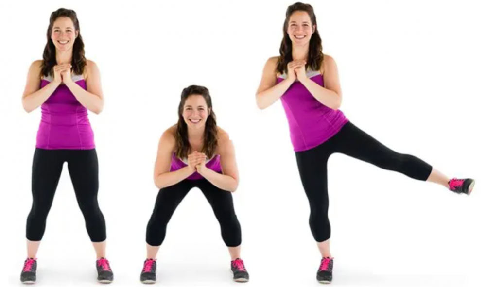 动作1: squat with side kick。双脚分开与肩同宽,蹲下,站起,同时重心移到一条腿上,另一条腿向侧面抬起;再蹲下,站起,换另一条腿抬起。大概30秒钟做18-20次的频率。