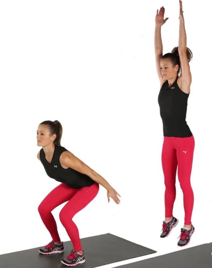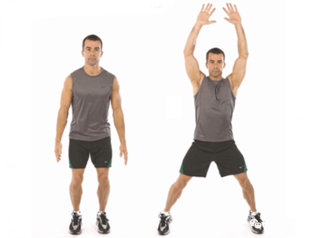 动作2: 做jumping jack,就是站直双手放在身体两侧,然后双脚跳开同时双手抬过头顶击掌。然后恢复站立姿势。30秒钟做30-35次。