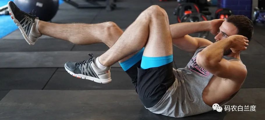 动作9: 仰卧骑自行车+起坐。平躺,双腿举起像骑自行车一样轮流蹬腿,同时向收腿的一方做仰卧起坐。胳膊肘要碰到膝盖才算标准。30秒做60-70次。