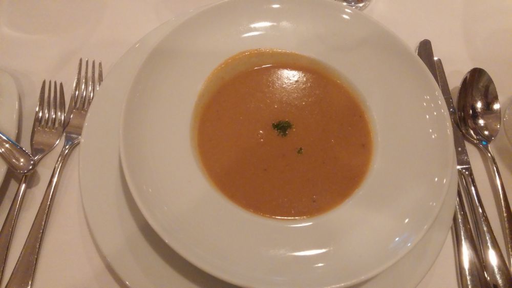 十分钟后,第一道菜上桌,西红柿龙虾开胃汤(Lobster bisque)。汤味鲜美,咸中略酸。加上红酒,让舌头领略到龙虾的味道。