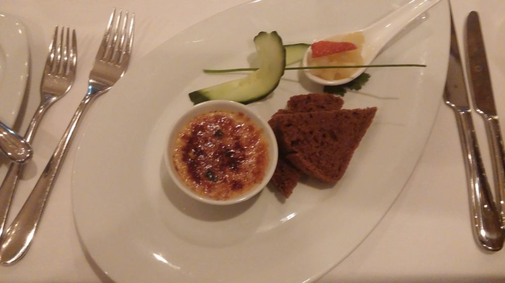 店内装潢中档偏上,窗明几净。侍者彬彬有礼,英语交流很容易。问了一下介绍,决定选择馆内的全套法国大餐,总共7道,加一瓶红葡萄酒。每人消费约一百加元。