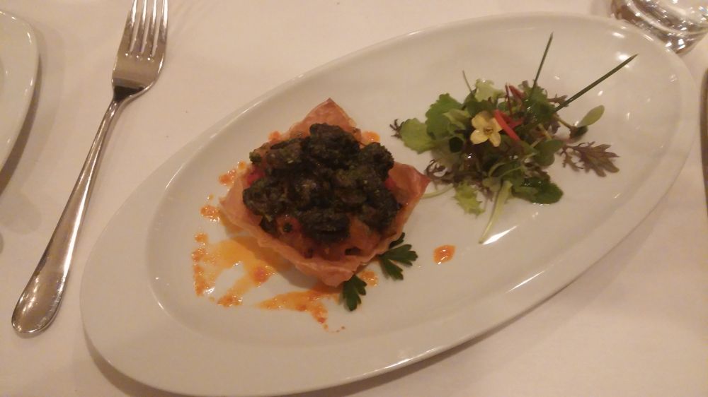 第三道是炸蘑菇放在面皮上,加上蔬菜陪衬 (Mushroom ravioli perfumed with fresh sage)。色彩般配得体,这道下去,稍唯有一些饱意了。