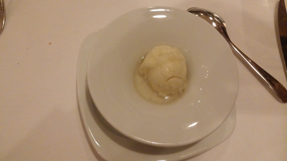 第四道味道变甜,应该是水果泥(Pear and tarragon sorbet)。在晚餐几道菜中间加一道甜点,略微有点奇怪。但这是在主菜之前,也算是铺垫。