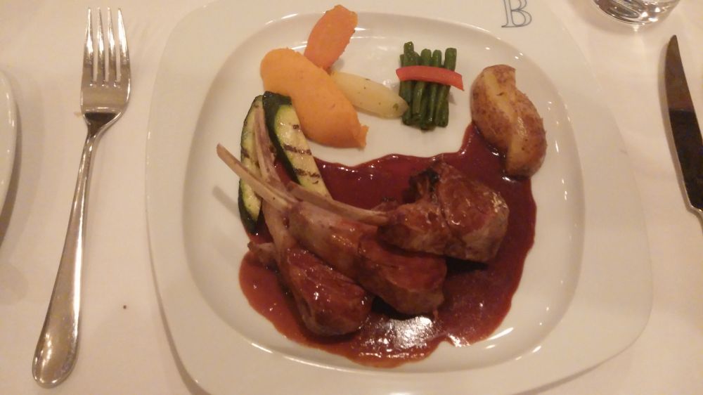 第五道是主餐,羊排(Roasted rack of lamb and port wine jus)。羊排做的到位,不硬,原羊味道。加上调汁,蔬菜配味,红酒助兴,晚餐的高潮来到。主餐下肚,基本上是吃饱了,但还有两道在后面。