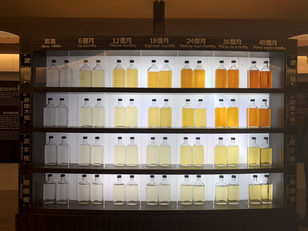 展示厅内展士了威士忌在不同橡木酒桶内不同时间时的成色。据说苏格兰威士忌常要在橡木酒桶放十年才装瓶。但 Kavalan 大约四年即可。据说这是因为宜兰终年高温,橡木酒桶和酒反应速度快。据酒师介绍,宜兰终年高温,橡木酒桶每年蒸发5%的酒液,十年后,一半酒已蒸发了。