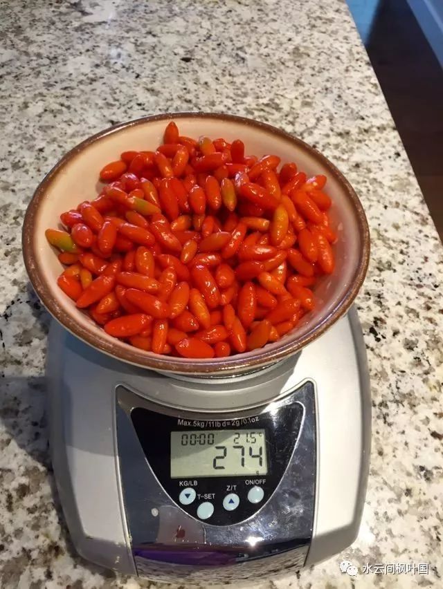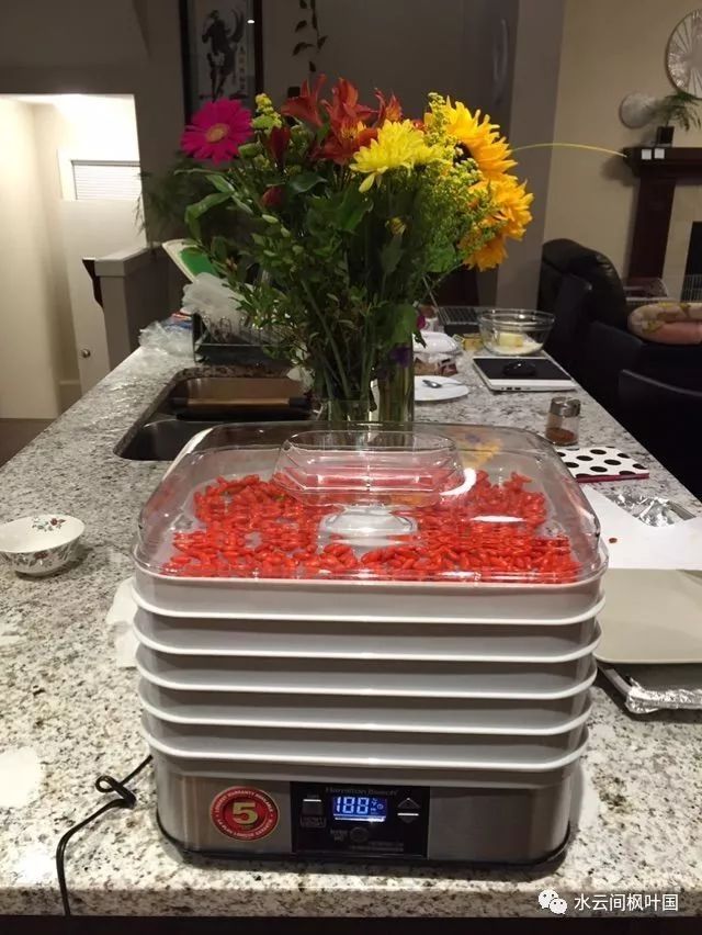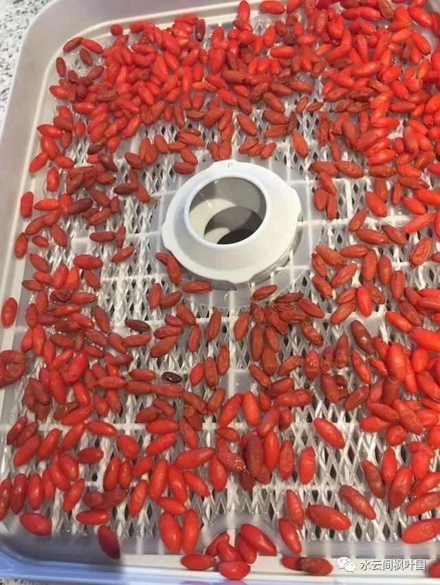 后面再收的枸杞,还需要另辟蹊径。听朋友提起食物烘干机,可以低温吹干水果蔬菜。立即在Costco网上买了一个,望眼欲穿地等着烘干机上门。一周后收到烘干机,迫不及待地将新摘的枸杞放进烘盘。烘了一夜发现,尽管把温度调到最低(40度),中间靠风口的枸杞还是熟了!又考虑,也许是枸杞熟透了容易损伤。于是摘下刚变红还带有绿色的半熟枸杞,又烘了一晚。结果仍然烤熟了许多。几天下来损失不小,生气退了烘干机。