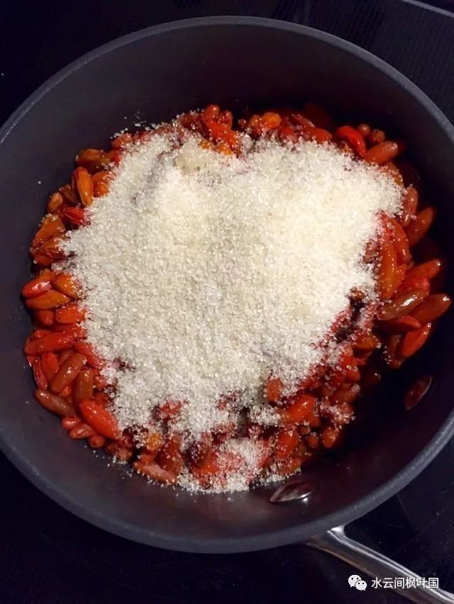 将枸杞倒入不沾小汤锅,加入白砂糖,小火熬制至水分蒸发,装瓶后冰箱冷藏保存。喝菊花茶的时候,放一小匙,还是清甜微苦的味道,只是少了整颗圆润红枸杞的卖相。