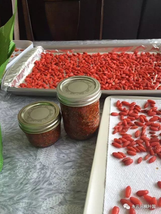 自己家产的纯天然枸杞,我自然不愿意加入小苏打粉。那么多不必要的钠,吃到肚子里,缺盐少油的饮食就变得毫无意义。于是,枸杞的晾晒时间就延长了几倍。面对每天两、三百克的收成,晾晒的工具很快就不够用了。为了加快晾晒速度,先是把烤盘放到园子里晒太阳,发现有小虫、苍蝇光顾。蒙上纱布,晾晒效果就像在家里阴干。听同事建议,放入预热50度的烤箱,几个小时过后,发现枸杞居然烤熟了,完全不见了原先的油亮红润!看着自己辛辛苦苦,一颗一颗流血流汗摘下来的烤熟的暗红色的难看的枸杞,实在有些欲哭无泪。心里想着不再花这功夫,让枸杞们自生自灭去吧。可是过后还是不愿暴敛天物。既然舍不得扔掉,干脆一不做二不休,把这些烤熟的枸杞熬成果酱。