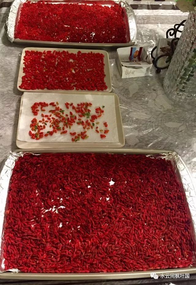 果子的保存是最大的问题。网上google了枸杞的晾晒工艺,首先需要“脱蜡”。就是把小苏打粉拌入收获的枸杞子里,使枸杞表面的果蜡脱落,这样枸杞容易脱水。然后铺晒晾干,几天后就可以收藏保存。