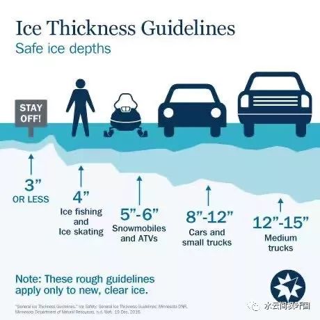 当然,相比钓鱼的乐趣,安全绝对是第一位的。本冰钓季才开始,就发生了钓友因冰薄溺水身亡的悲剧。还有一辆卡车陷入湖中被冻住。下图的冰厚指南需要严格遵守。