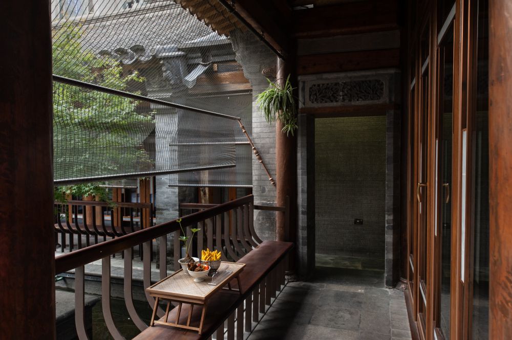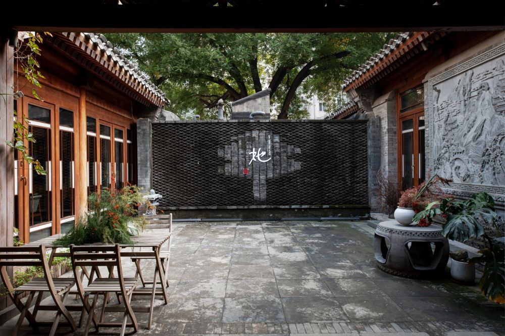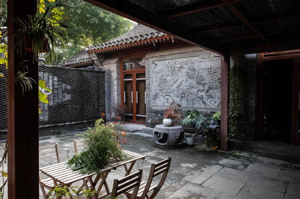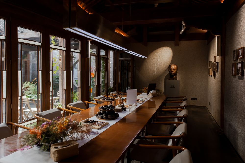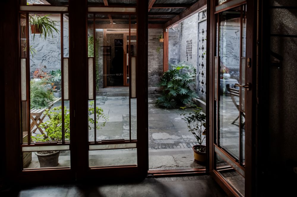 步入槐轩,我发现这个重新设计修缮的四合院非常现代,文艺,唯美。四合院保留了原有的古建规制和中轴对称的格局,所有房间的墙体和屋顶都做了更新加固,门楣与戗檐上的砖雕,老房梁,老瓦片等也都与当年保持一致,但同时又加入了现代落地窗与游廊的设计。最大的改动是将原来的土地庭院变成了水景庭院,游廊的四角还放置了“美人靠”来配合水流潺潺的意境。水景庭院的设计是别有巧思吗?见仁见智吧,至少我个人认为这是一个败笔。原本完整的土地被支解切割了,加上居中安置的太湖石,这么一来,院内几乎没有了休闲空间,俞老与家人当年在院中槐树下写作、吃饭、闲聊、纳凉的情景不可能再现了,那么庭院的存在还有什么意义呢?